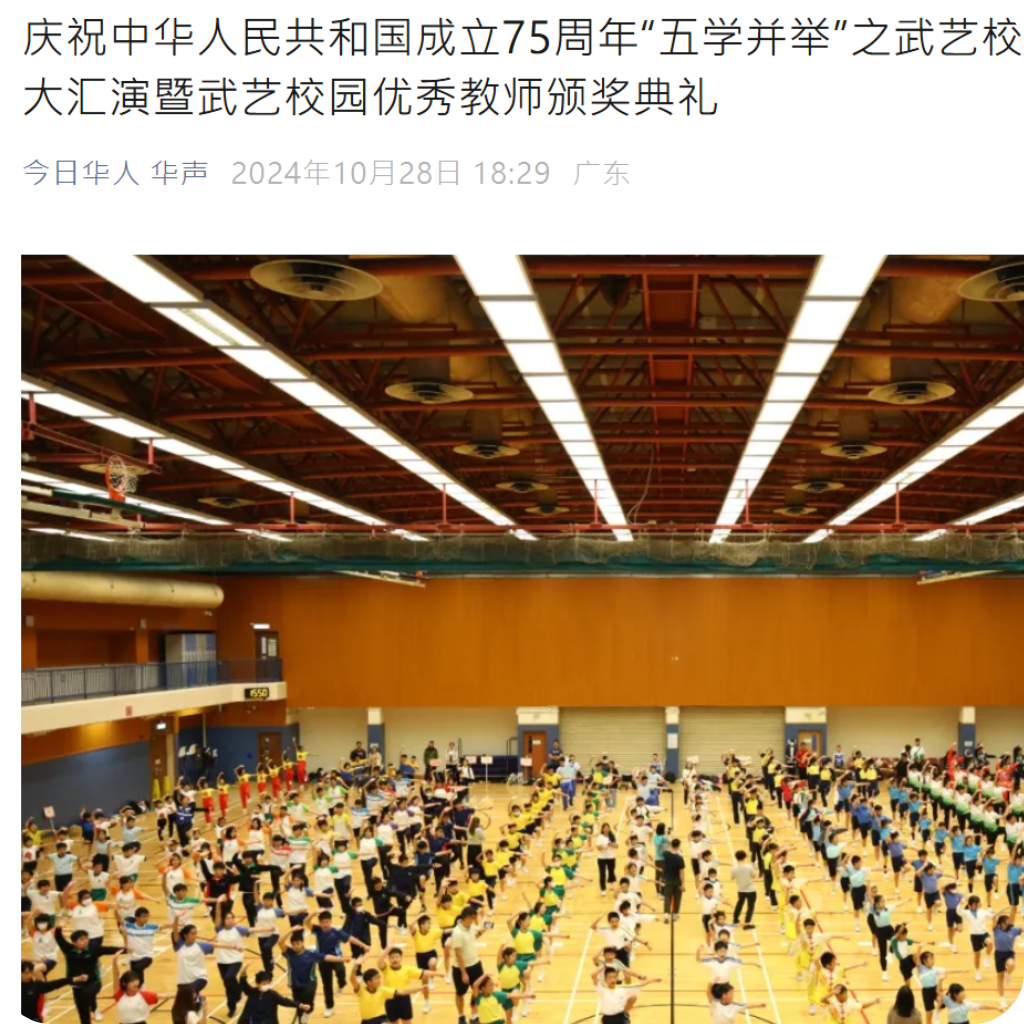 今日華人 華聲|慶祝中華人民共和國成立75周年「五學並舉」之武藝校園計劃-武藝操大匯演暨武藝校園優秀教師頒獎典禮 |