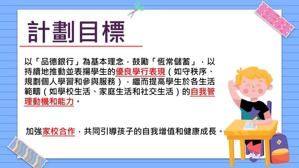 金戰士獎勵計劃(Reward Scheme for Excellence at School)為校本學生獎勵計劃,計劃以「品德銀行」為基本理念,鼓勵學生「恆常儲蓄」良好學行。學校會持續表揚學生的優良學行表現(如謹言慎行、規劃個人學習和積極參與服務),期望
