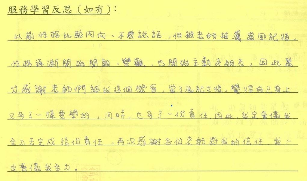 關顧同學,協助維持同學的秩序,使同學養成遵守校規和秩序的習慣。