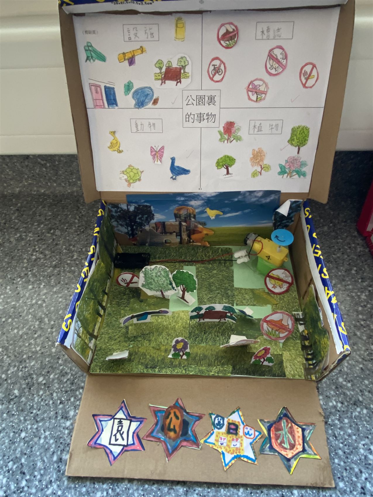 一年級學生正在使用燈喉、紙皮、木板等材料制作他們親自設計的安樂窩。